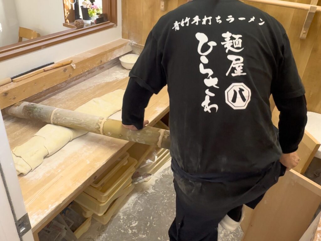 やっぱり最初は青竹打ちですね。実際に見たときに「こうやって麺を作っているんだ」と驚きました。それまで麺は機械で作るものだと思っていたので、竹を使って人の力で麺を打っている姿がすごく印象に残ったんです。見た目のインパクトもありますし、「らーめんの麺ってこんな作り方もあるんだ」と純粋に驚きました。