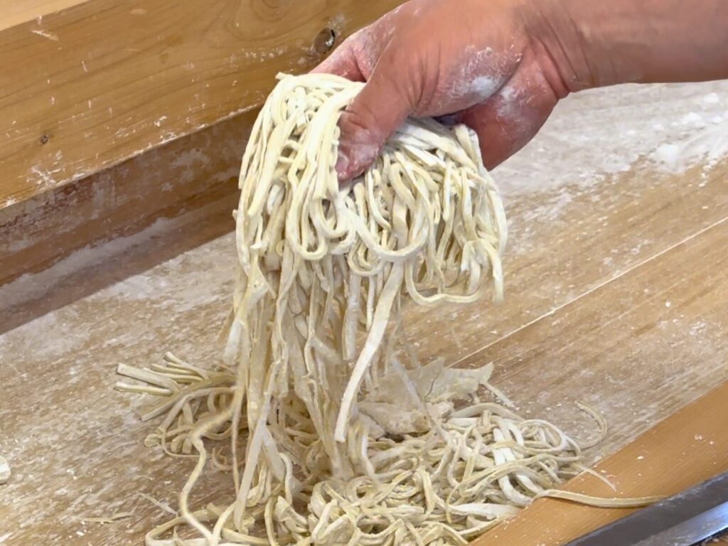 ありますね。でも、食べてみてさらに面白いと思いました。手打ちの麺って、一本一本が完全に同じじゃないんです。太さも少しずつ違うし、縮れ方も違う。その不揃いさが食べたときの食感になっていて、機械麺とは違う面白さがありました。